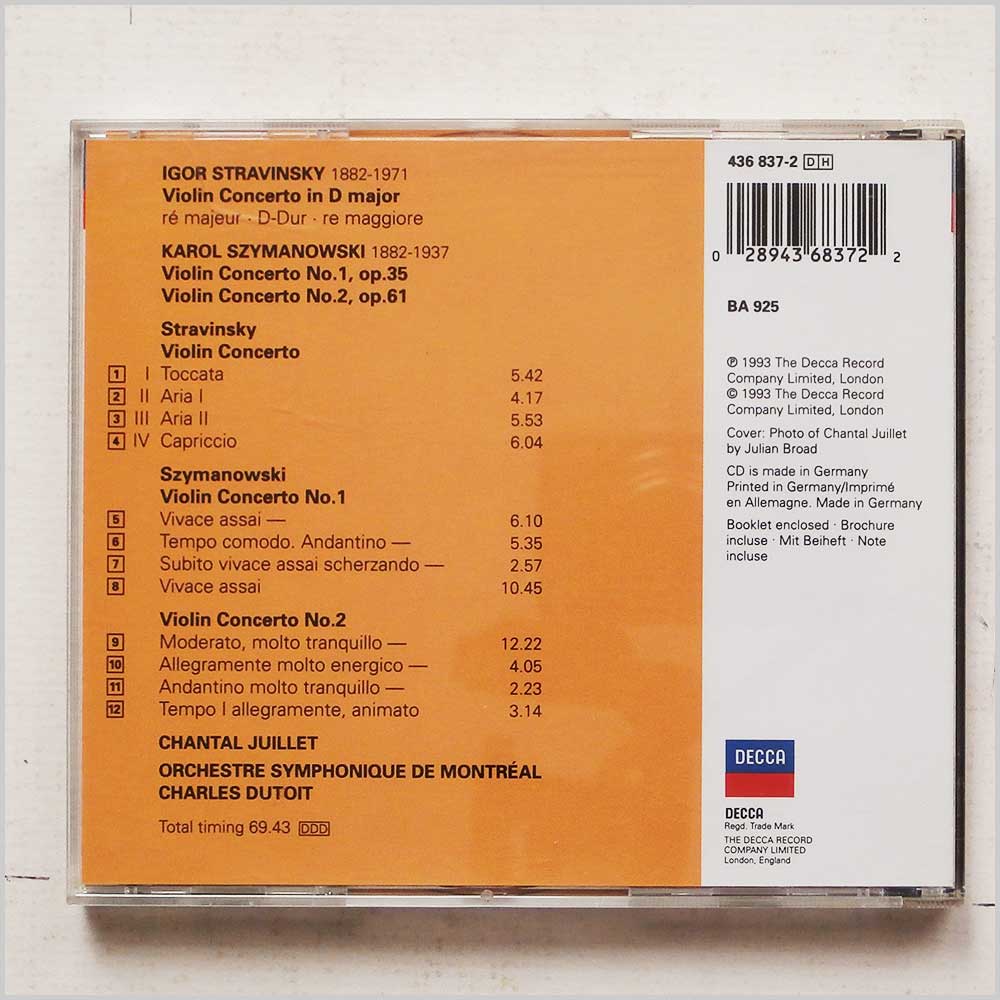 Format: Music CD, Decca Records. Classical music CD release from Chantal Juillet with the album Stravinsky: Violin Concerto, Szymanowski: Violin Concerto. Released on the label Decca Records. Classical music CD. This hard to find pre-owned music CD is fully guaranteed. Record label: Decca Grade: CD: NM, Case: NM Stock: 1. Item: PM475528943683722 ---J