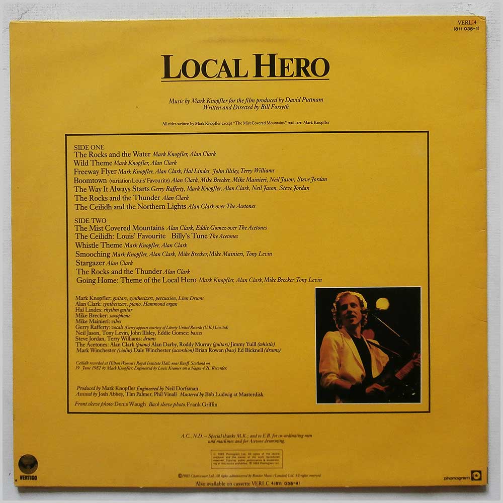 Format: Vinyl Record LP, Vertigo Records. UK release from 1983. Rock music vinyl record LP release from Mark Knopfler (member of the rock group Dire Straits). Music from the Bill Forsyth movie Local Hero. Classic Dire Fusion music LP. Record label: Vertigo Records. UK Grade: Vinyl VG+, Jacket VG+ Stock: 1. Item: RM28600verl4 ---K