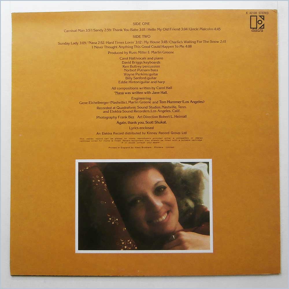 Format: Vinyl Record LP, Elektra Records. UK release from 1972. Rock music vinyl record LP release from Carol Hall. Comes with the original fold out lyric sheet. First or early UK pressing with A-1 and B-1 in run out grooves. Lovely fresh and clean copy. Record label: Elektra Records. UK Grade: Vinyl EX, Jacket EX Stock: 1. Item: RM5755k42108 ---H