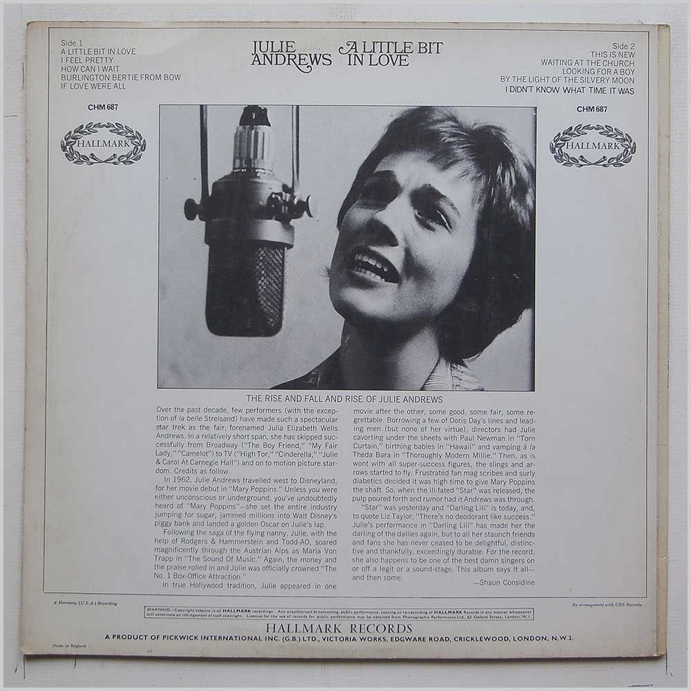 Format: Vinyl Record LP, Hallmark Records. UK release from 1970. Jazz music vinyl record LP release from Julie Andrews. Classic Music Hall, Vocal Jazz music LP. Record label: Hallmark Records. UK Grade: Vinyl EX, Jacket VG+ Stock: 1. Item: RM13901chm687 ---A