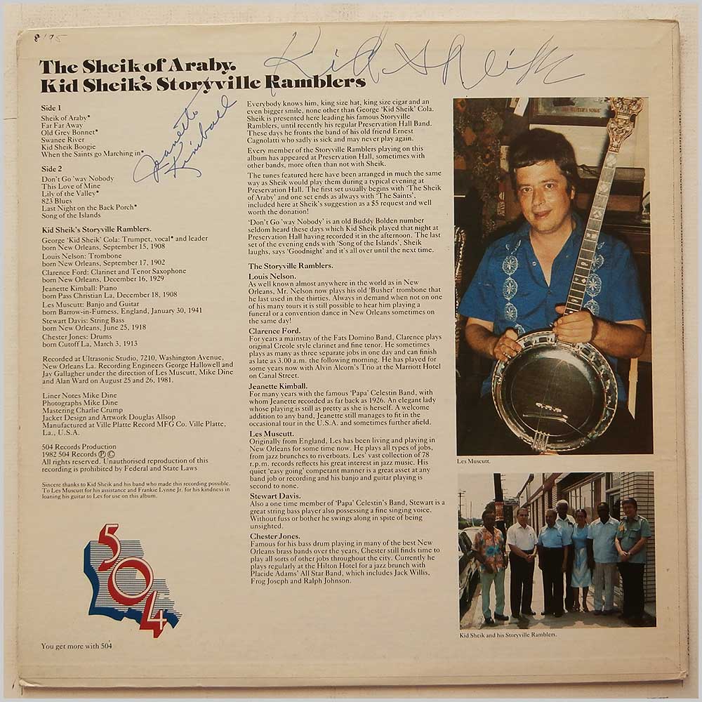 Format: Vinyl Record LP, 504 Records. USA release from 1981. Jazz music vinyl record LP release from Kid Sheik's Storyville Ramblers. Classic New Orleans Jazz music LP. Signed on the back of the jacket by Kid Sheik and piano player Jeanette Kimball. A United States vinyl pressing, hard to find outside the USA. Record label: 504 Records. USA Grade: Vinyl EX, Jacket VG+ Stock: 1. Item: RM16930504lps1 ---S