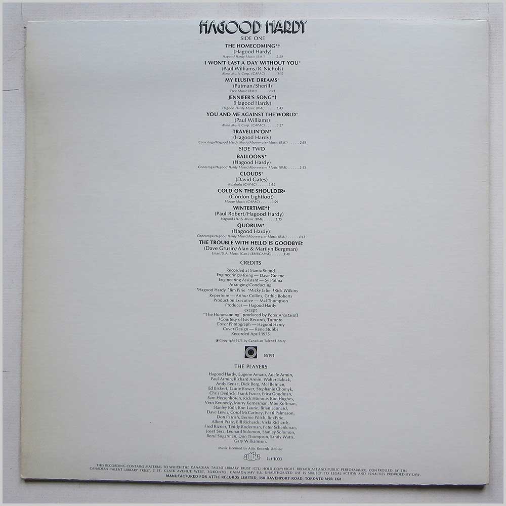Format: Vinyl Record LP, Attic Records. Canada release from 1975. Jazz music vinyl record LP release from Hagood Hardy. Easy Listening Jazz music LP. Lovely fresh and clean copy. Record label: Attic Records. Canada Grade: Vinyl VG+, Jacket EX Stock: 1. Item: RM10108lat1003 ---H