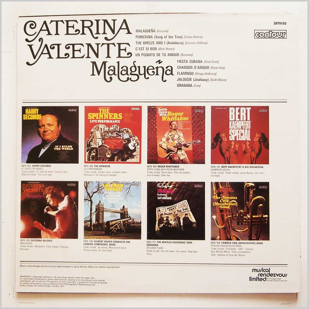 Format: Vinyl Record LP, Contour Records. UK release. Latin music vinyl record LP release from Caterina Valente. Classic Chanson Latin music LP. Housed in a laminated jacket. Record label: Contour Records. UK Grade: Vinyl EX, Jacket VG+ Stock: 1. Item: RM16082contour2870103 ---V