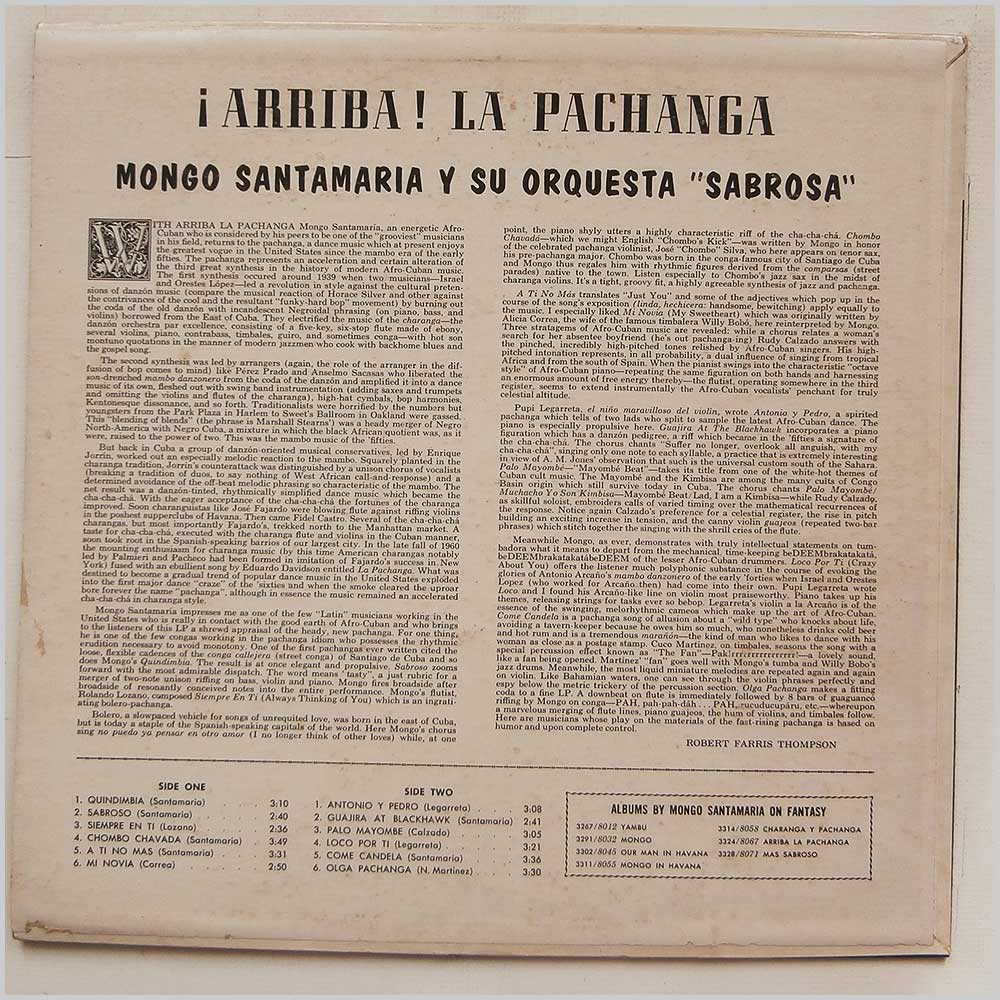 Format: Vinyl Record LP, Fantasy Records. USA release. Latin music vinyl record LP release from Mongo Santamaria y Su Orquesta Sabrosa. Classic Afro-Latin Jazz, Guaguanco, Cha-Cha, Pachanga, Charanga, Salsa music LP. The record is pressed on standard black vinyl. Clear sticky tape applied along edges of jacket. Small bit of writing on jacket. A United States vinyl pressing, hard to find outside the USA. Record label: Fantasy Records. USA Grade: Vinyl VG+, Jacket VG+ Stock: 1. Item: RM28049fantasy3328 ---S