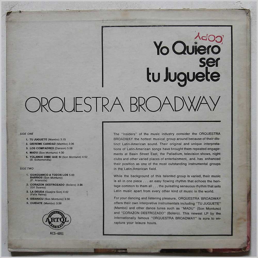 Format: Vinyl Record LP, Artol Records. USA release from 1970. Latin music vinyl record LP release from Orquesta Broadway. Classic Latin Charanga, Son Montuno, Guaguanco, Salsa music LP. Some light scuffing to record. Some light marks on record. Some wear to jacket edges. A United States vinyl pressing, hard to find outside the USA. Record label: Artol Records. USA Grade: Vinyl VG, Jacket VG Stock: 1. Item: RM28642artol6051 ---B