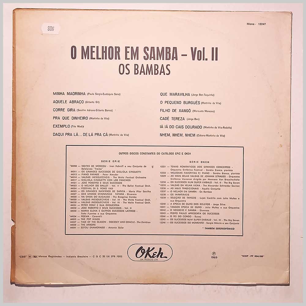 Format: Vinyl Record LP, Okeh Records. Brazil release from 1969. Brazilian music vinyl record LP release from Os Bambas. Classic Brazilian music LP. Jacket is a thin paper sleeve folded once. Some light scuffing to record. Record label: Okeh Records. Brazil Grade: Vinyl VG, Jacket VG+ Stock: 1. Item: RM3333012247 ---B