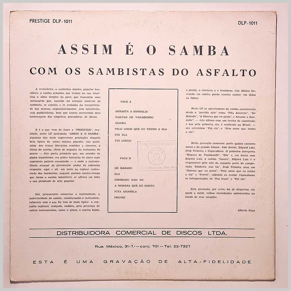 Format: Vinyl Record LP, Prestige Records. Brazil release. Brazilian music vinyl record LP release from Sambistas Do Asfalto. Classic Brazilian Samba music LP. Some light scuffing to record. Record label: Prestige Records. Brazil Grade: Vinyl VG, Jacket VG+ Stock: 1. Item: RM33328dlp1011 ---S