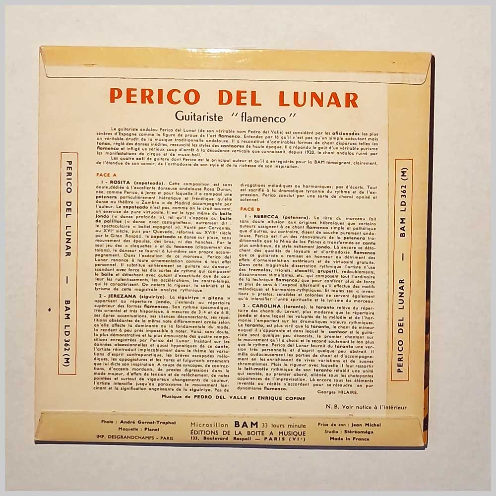 Format: Vinyl Record 7in, BAM Records. France release. Roots music vinyl record 7 inch EP release from Perico Del Lunar. Classic Flamenco Roots music 7in. 4 tracks. The record plays ar 33 rpm. Housed in its original picture sleeve. Record label: BAM Records. France Grade: Vinyl EX, Jacket EX Stock: 1. Item: RM33155bamld362m ---D