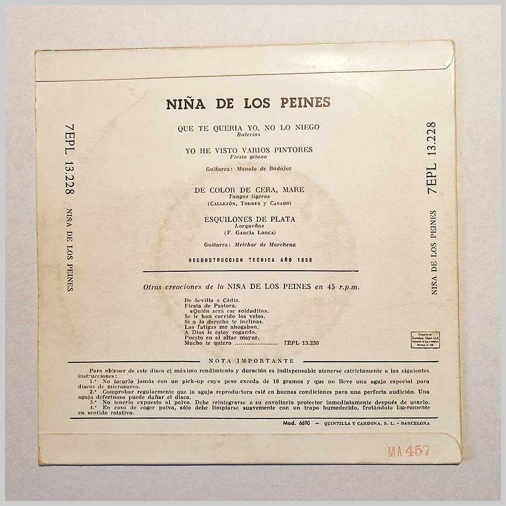 Format: Vinyl Record 7in, La-Voz-De-Su-Amo Records. Spain release. Roots music vinyl record 7 inch EP release from Nina De Los Peines. Classic Flamenco Roots music 7in. 4 tracks. Housed in its original picture sleeve. Some light wear to jacket edges. Record label: La-Voz-De-Su-Amo Records. Spain Grade: Vinyl VG+, Jacket VG+ Stock: 1. Item: RM331577epl13230 ---D