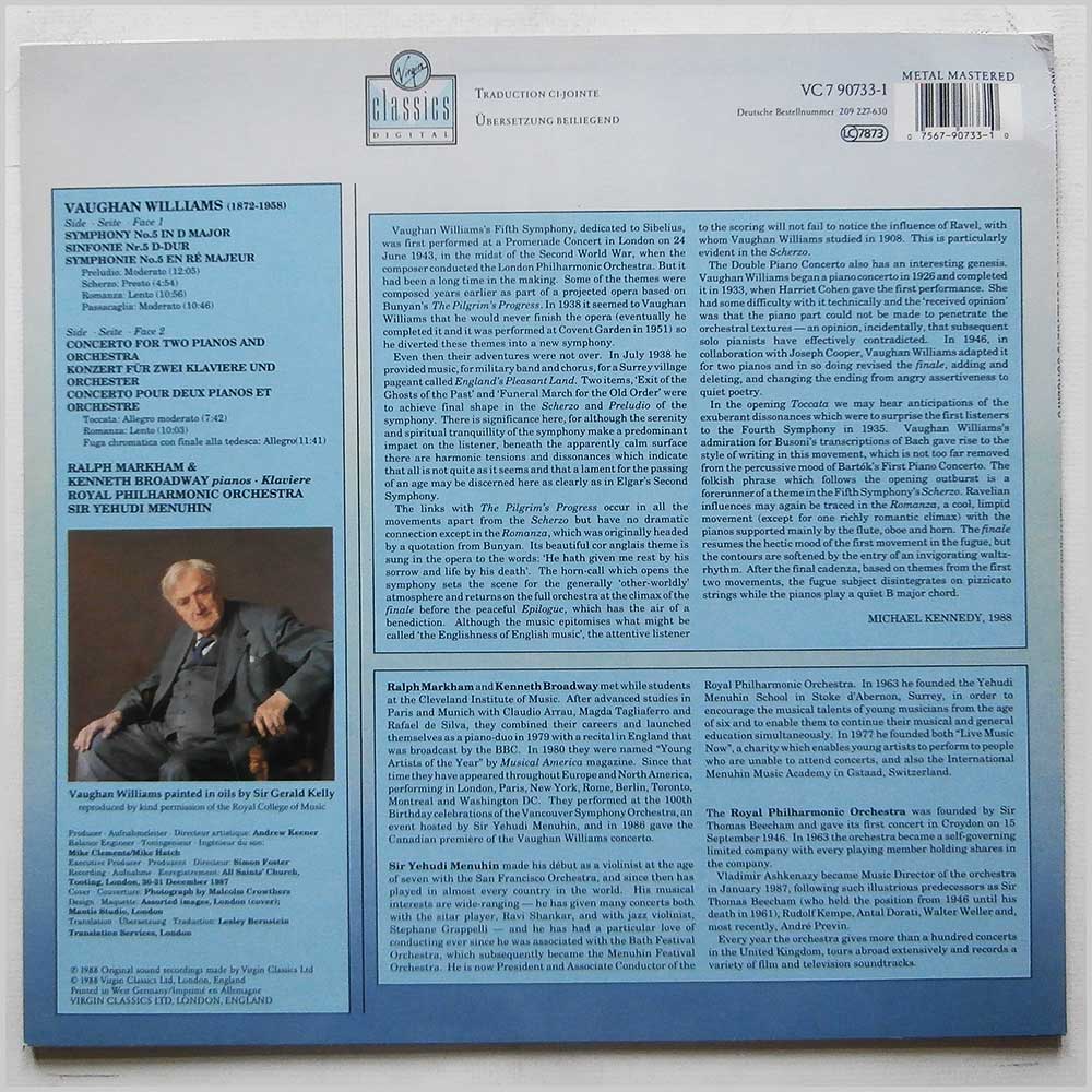Format: Vinyl Record LP, Virgin Records. Germany release. Classical music vinyl record LP release from Sir Yehudi Menuhin, Ralph Markham, Kenneth Broadway, Royal Philharmonic Orchestra. Classical music LP. Comes with the original notes sheet. Lovely fresh and clean copy. A Classical music vinyl record album release featuring some of the top composers and performers. Record label: Virgin Records. Germany Grade: Vinyl EX, Jacket EX Stock: 1. Item: RM21940vc7907331 ---M