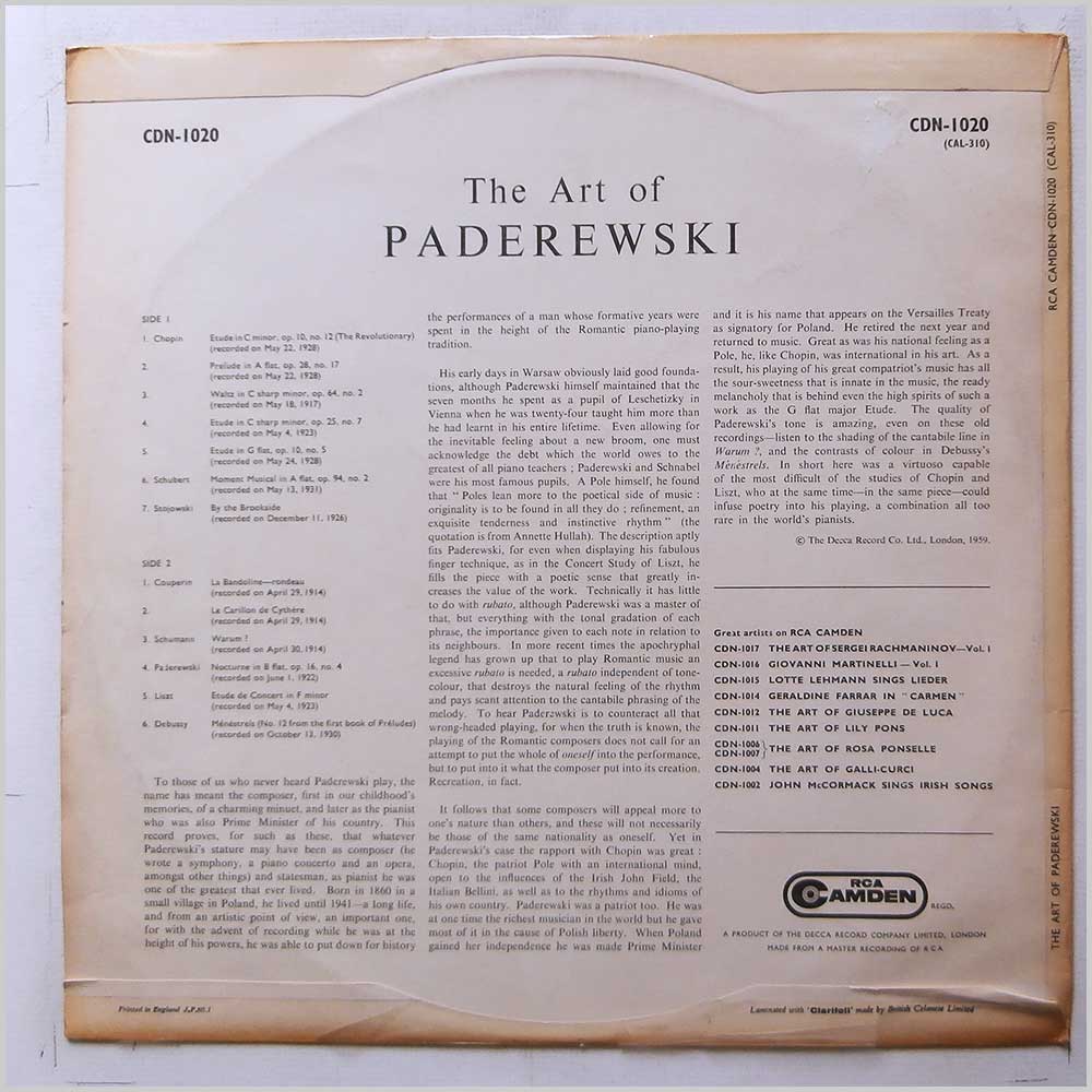 Format: Vinyl Record LP, RCA-Camden Records. Australia release. Classical music vinyl record LP release from Jan Paderewski. Classical music LP. Housed in a flip back style jacket. A nice copy considering its age. Classical music vinyl record album release featuring some of the top composers and performers. Record label: RCA-Camden Records. Australia Grade: Vinyl VG+, Jacket VG Stock: 1. Item: RM32692cam3 ---P