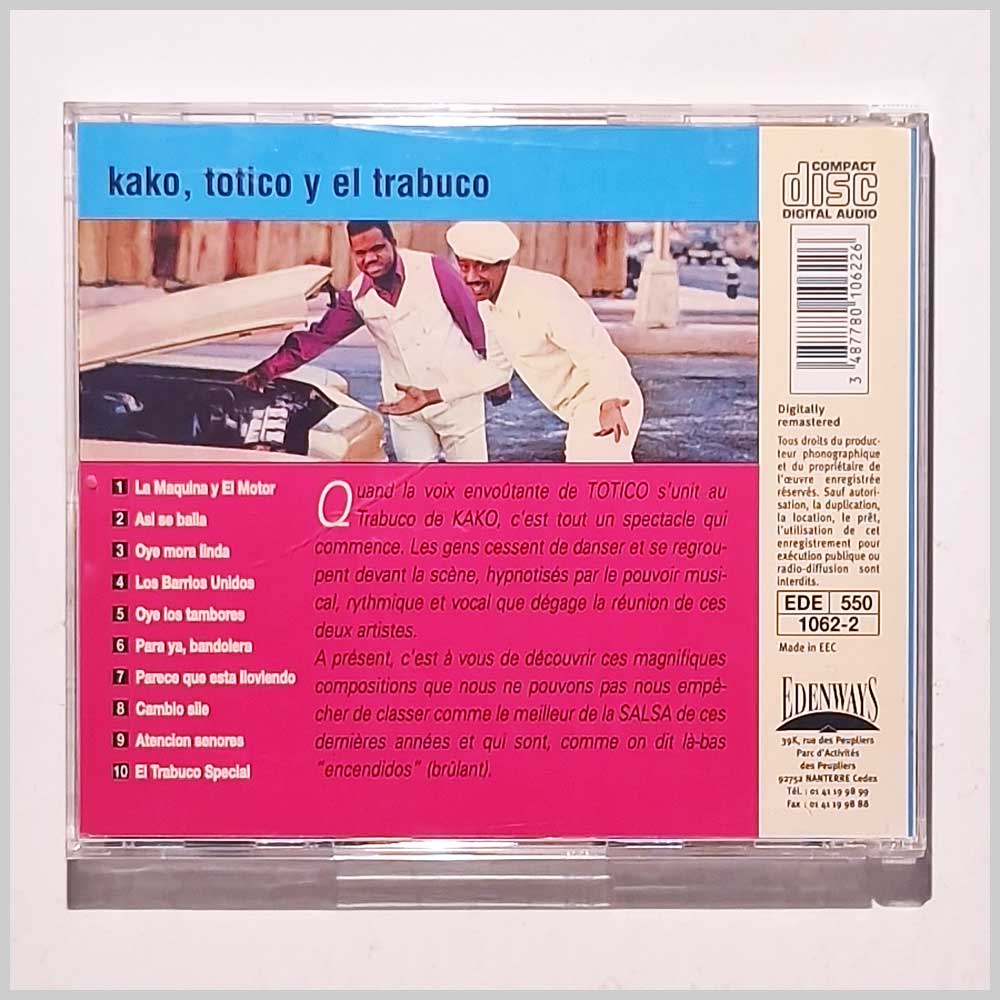 Format: Music CD, Edenways Records. Latin music CD release from Kako Y Totico with the album Kako, Totico y El Trabuco: La Maquina Y El Motor. Released on the label Edenways Records. Latin music CD. Classic Salsa Music CD. In excellent condition. Latin Jazz music CD. This hard to find pre-owned music CD is fully guaranteed. Record label: Edenways Grade: CD: EX, Case: EX Stock: 1. Item: PM7413ede10622 ---K