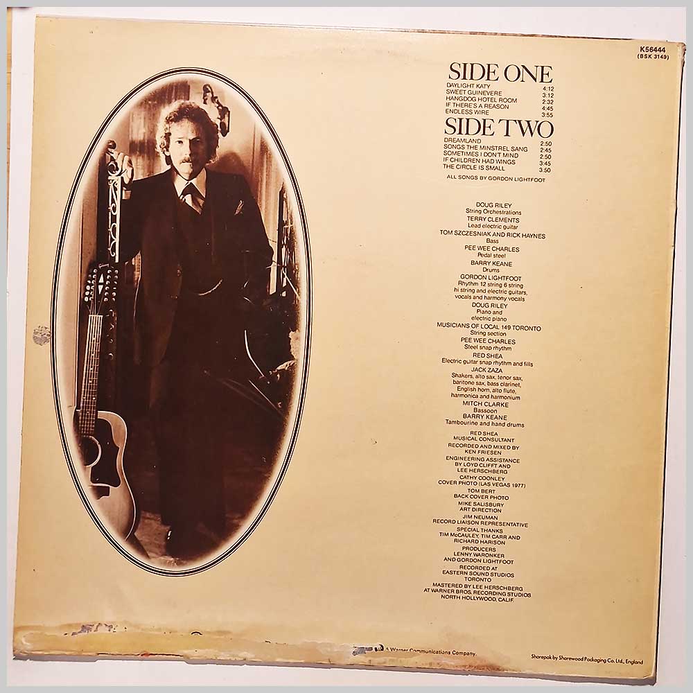 Format: Vinyl Record LP, Warner-Bros Records. UK release from 1978. Rock music vinyl record LP release from Gordon Lightfoot. Classic Rock music LP. Comes with the original inner sleeve. Some minor water staining and damage to bottom of jacket and inner sleeve. Record label: Warner-Bros Records. UK Grade: Vinyl VG+, Jacket VG Stock: 1. Item: RM33485k56444 ---L