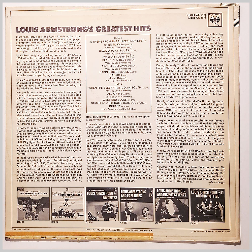 Format: Vinyl Record LP, Columbia Records. USA release from 1967. Jazz music vinyl record LP release from Louis Armstrong. Classic Jazz music LP. 360 Sound Stereo issue. Some light handling wear and tear to jacket. Some wear to jacket edges. A United States vinyl pressing, hard to find outside the USA. Record label: Columbia Records. USA Grade: Vinyl VG+, Jacket VG+ Stock: 1. Item: RM33683cs9438 ---A