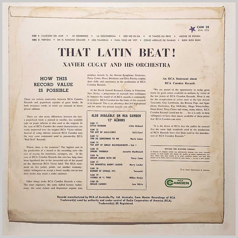 Format: Vinyl Record LP, RCA-Camden Records. USA release from 1959. Latin music vinyl record LP release from Xavier Cugat and His Orchestra. Classic Latin Rumba music LP. Some light handling wear and tear to jacket. A United States vinyl pressing, hard to find outside the USA. Record label: RCA-Camden Records. USA Grade: Vinyl VG+, Jacket VG+ Stock: 1. Item: RM33342cam28 ---C