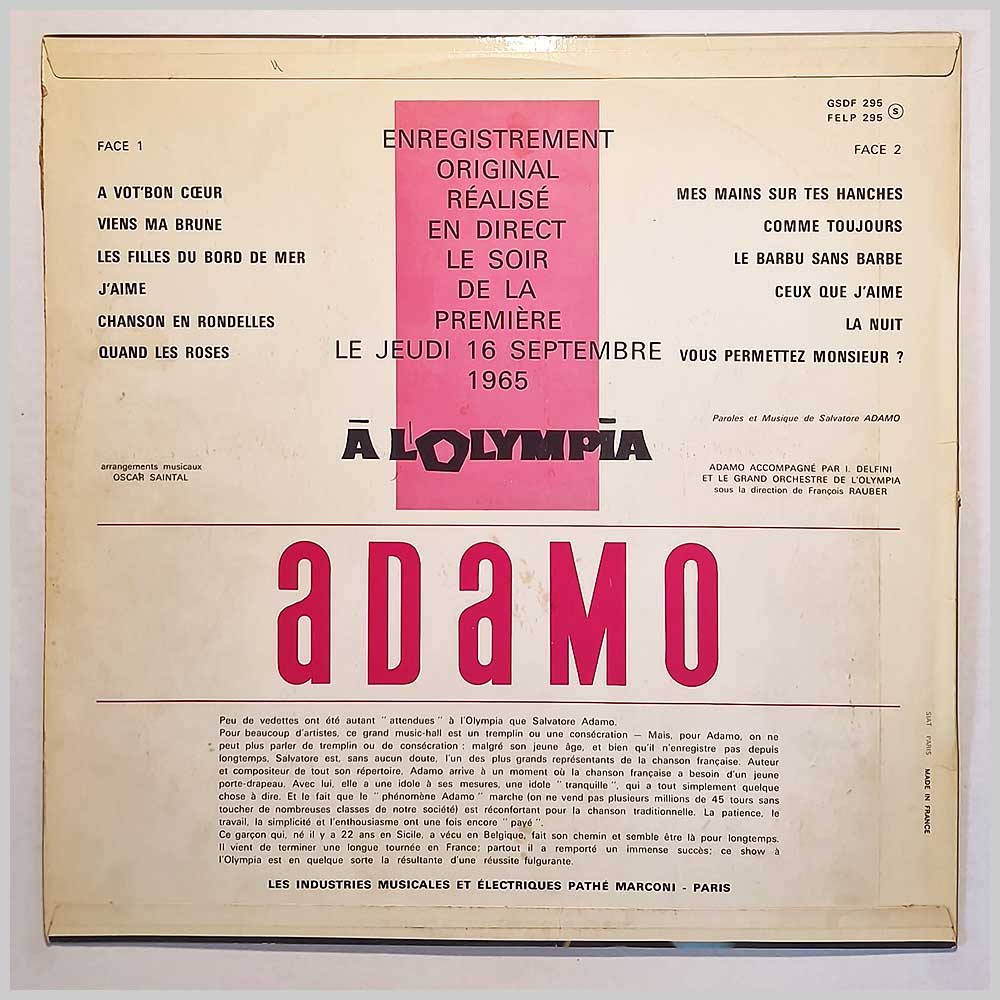 Format: Vinyl Record LP, La-Voix-De-Son-Maitre Records. France release from 1965. Roots music vinyl record LP release from Adamo. Classic French Chanson, Vocal music LP. Housed in a flip back style jacket. Some light scuffing to record. Record label: La-Voix-De-Son-Maitre Records. France Grade: Vinyl VG, Jacket VG+ Stock: 1. Item: RM33123felp295 ---A