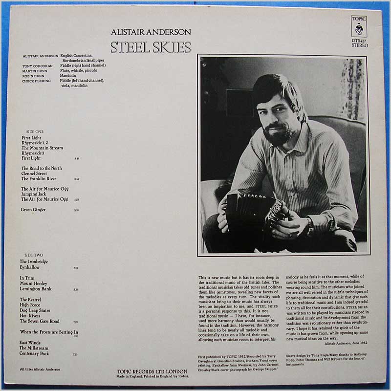Format: Vinyl Record LP, Topic Records. UK release from 1982. Concertina virtuoso Alistair Anderson with an album of all his own material. Musicians include: Alistair Anderson - English concertina, Northumbrian small pipes; Tony Corcoran Fiddle; Martin Dunn - Flute, whistle, piccolo; Robin Dunn - Mandolin; Chuck Fleming - Fiddle, viola, mandolin. 9 tracks. Lovely fresh and clean copy. Record label: Topic Records. UK Grade: Vinyl EX, Jacket NM Stock: 1. Item: RM84312ts427 ---A