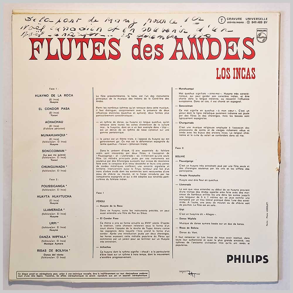 Format: Vinyl Record LP, Philips Records. France release from 1967. Roots music vinyl record LP release from Los Incas. Classic Andes Roots music LP. Some light wear to jacket edges. Record label: Philips Records. France Grade: Vinyl EX, Jacket VG+ Stock: 1. Item: RM33126849489by ---I