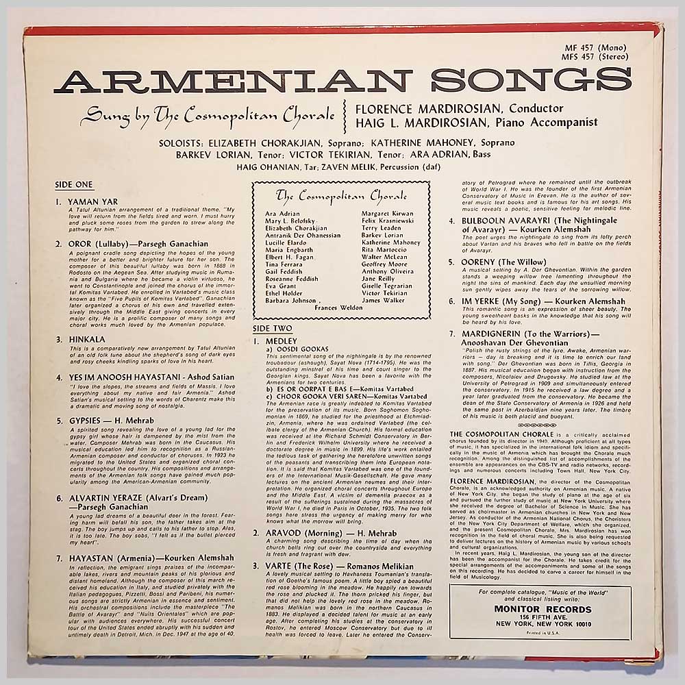 Format: Vinyl Record LP, Monitor Records. USA release. Roots music vinyl record LP release from The Cosmopolitan Chorale. Classic Armenian Roots music LP. Stereo issue (despite mono cat. number). Lovely fresh and clean copy. A United States vinyl pressing, hard to find outside the USA. Record label: Monitor Records. USA Grade: Vinyl EX, Jacket EX Stock: 1. Item: RM33133mf457 ---C