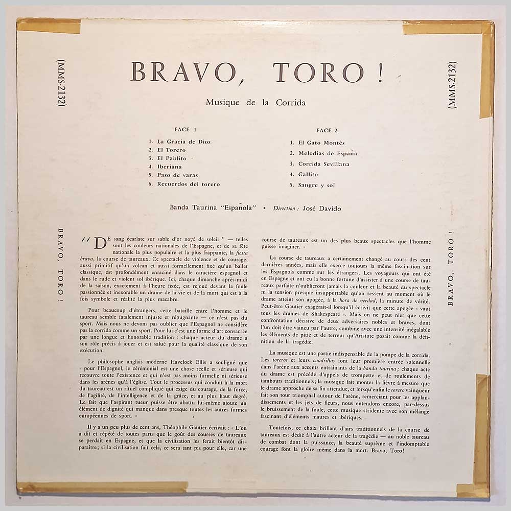 Format: Vinyl Record LP, Guilde-Internationale-Du-Disque Records. France release from 1960. Roots music vinyl record LP release from Banda Taurina Espanola, Jose Davido. Classic Spanish Bull Ring, Roots music LP. Clear sticky tape applied along edges of jacket. Some light scuffing to record. Record label: Guilde-Internationale-Du-Disque Records. France Grade: Vinyl VG, Jacket VG+ Stock: 1. Item: RM33131mms2132 ---B