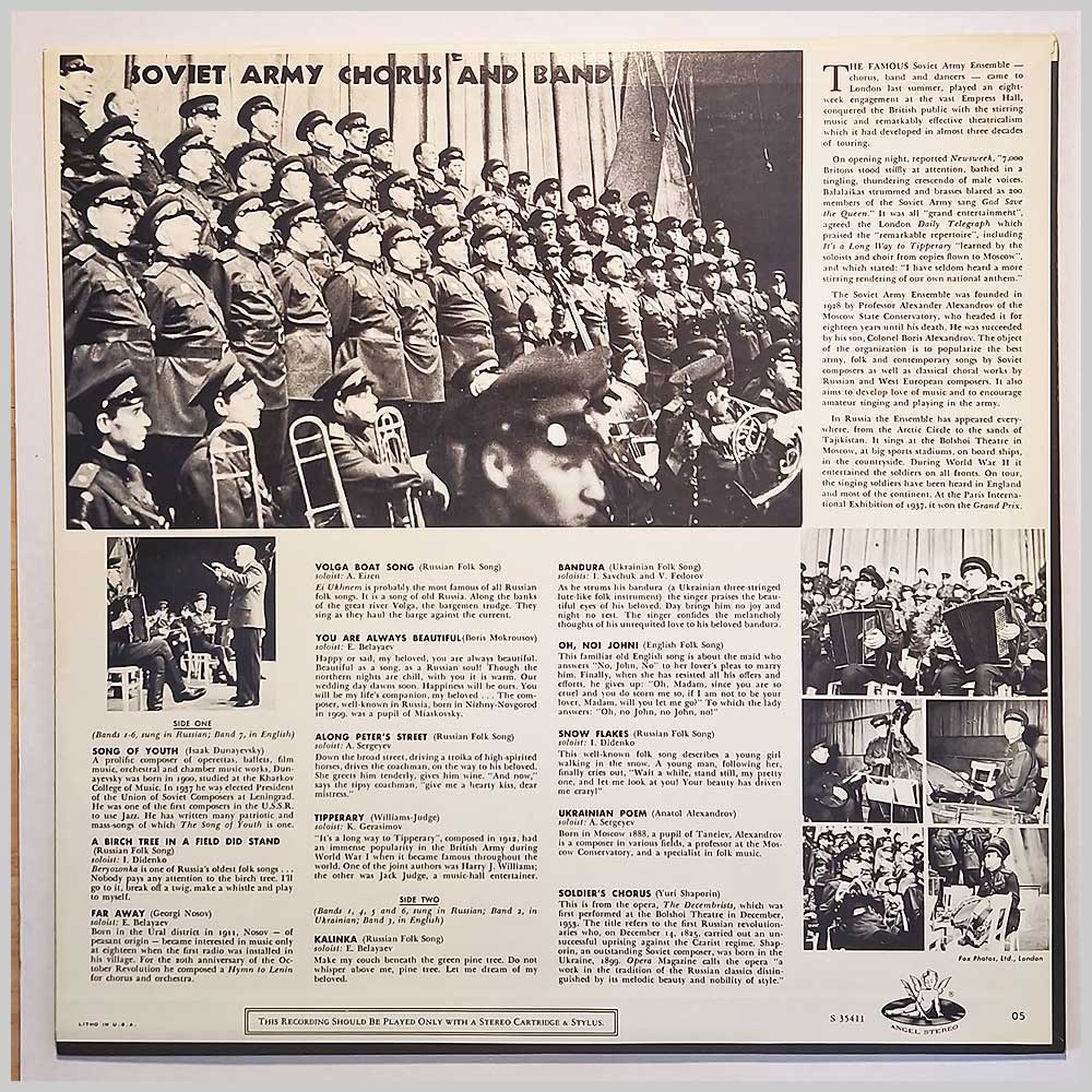 Format: Vinyl Record LP, Angel Records. USA release. Roots music vinyl record LP release from Soviet Army Chorus and Band. Classic Soviet era Military Roots music LP. The vinyl record appears to have had little or no play. Lovely fresh and clean copy. A United States vinyl pressing, hard to find outside the USA. Record label: Angel Records. USA Grade: Vinyl EX, Jacket EX Stock: 1. Item: RM33134s35411 ---S