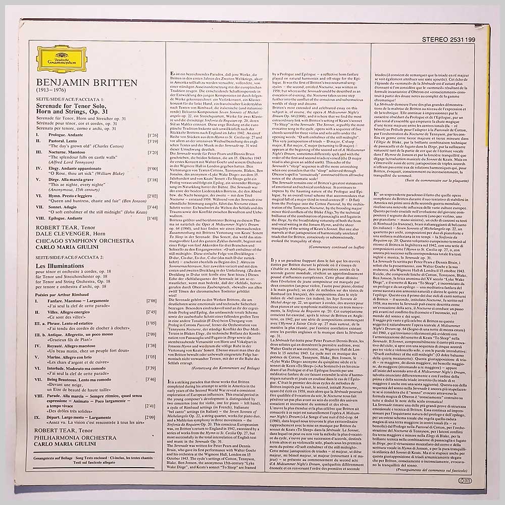 Format: Vinyl Record LP, Deutsche-Grammophon Records. Germany release. Classical music vinyl record LP release from Robert Tear, Dale Clevenger, Chicago Symphony Orchestra, Philharmonia Orchestra, Carlo Maria Giulini. Classical music LP. Comes with the original lyric sheet. Classical music vinyl record album release featuring some of the top composers and performers. Record label: Deutsche-Grammophon Records. Germany Grade: Vinyl EX, Jacket VG+ Stock: 1. Item: RM333962531199 ---T