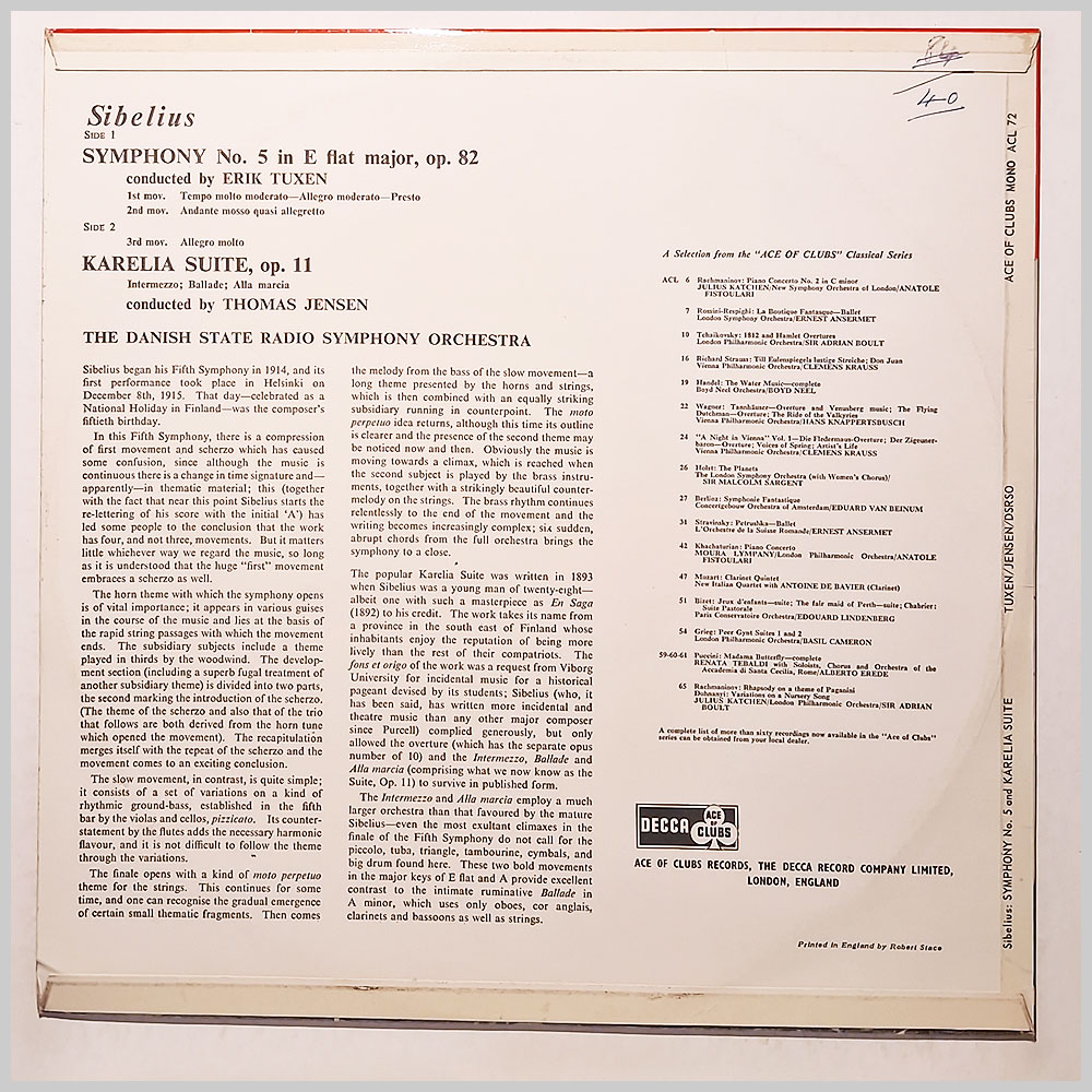Format: Vinyl Record LP, Ace Of Clubs Records. UK release. Classical music vinyl record LP release from Erik Tuxen, Thomas Jensen, The Danish State Radio Symphony Orchestra. Classical music LP. Housed in a flip back style jacket. Classical music vinyl record album release featuring some of the top composers and performers. Record label: Ace Of Clubs Records. UK Grade: Vinyl VG+, Jacket VG+ Stock: 1. Item: RM33675acl72 ---T