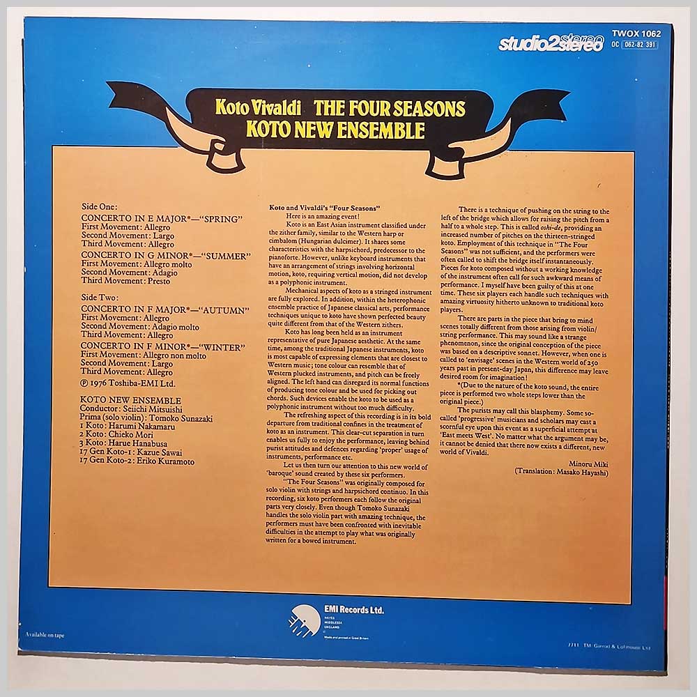 Format: Vinyl Record LP, EMI Records. UK release. Classical music vinyl record LP release from New Koto Ensemble. Classical music LP. Housed in a laminated jacket. Classical music vinyl record album release featuring some of the top composers and performers. Record label: EMI Records. UK Grade: Vinyl EX, Jacket EX Stock: 1. Item: RM33664twox1062 ---N