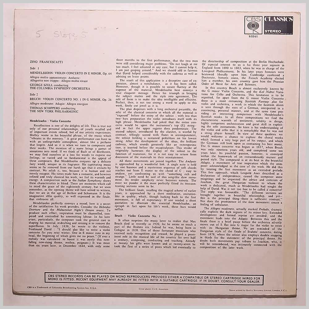 Format: Vinyl Record LP, CBS-Classics Records. UK release. Classical music vinyl record LP release from Zino Francescatti, The Columbia Symphony Orchestra, The New York Philharmonic, George Szell, Thomas Schippers. Classical music LP. Classical music vinyl record album release featuring some of the top composers and performers. Record label: CBS-Classics Records. UK Grade: Vinyl EX, Jacket VG+ Stock: 1. Item: RM33438s61061 ---F