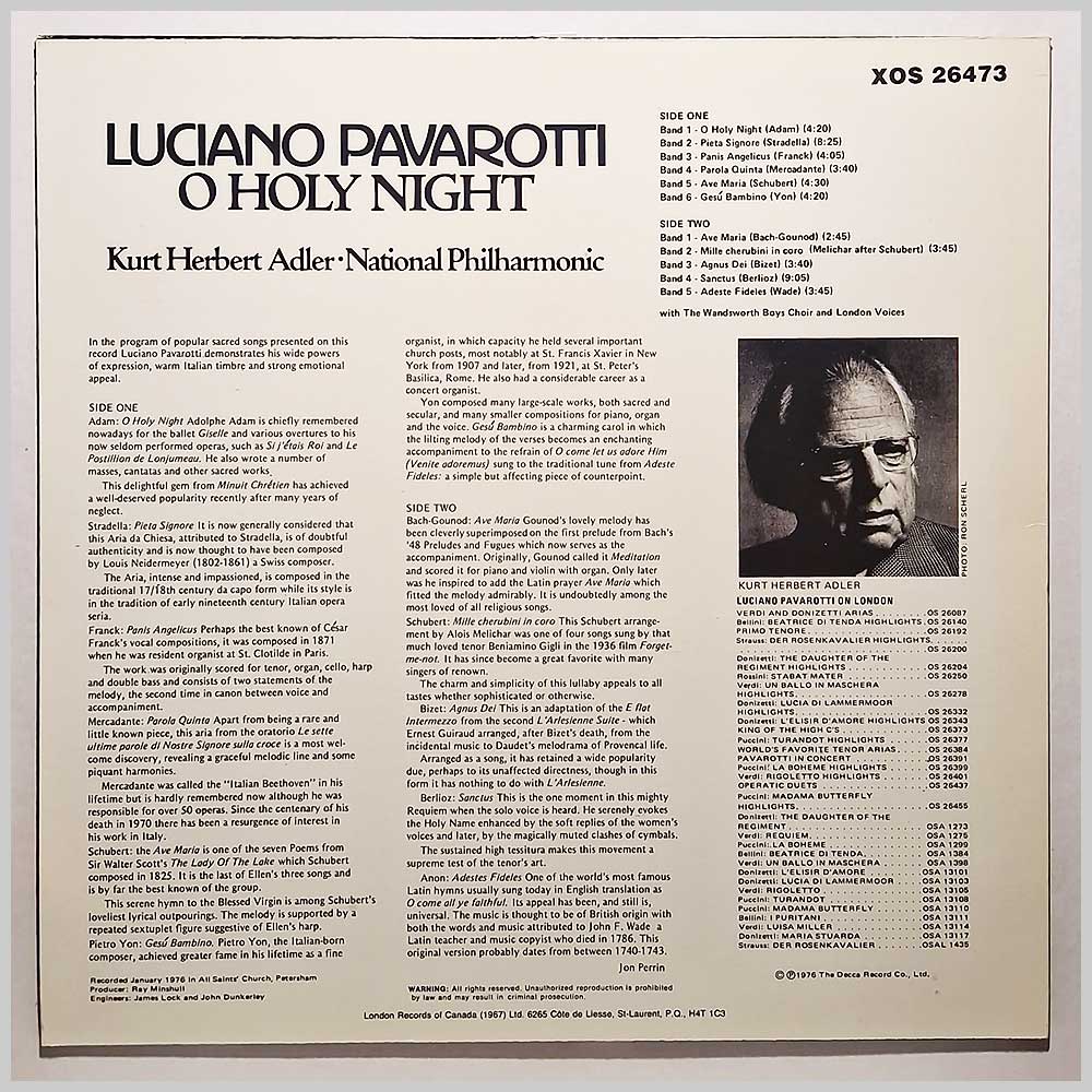 Format: Vinyl Record LP, Decca Records. Canada release. Classical music vinyl record LP release from Luciano Pavarotti, Kurt Herbert Adler, National Philharmonic. Classical music LP. The vinyl record appears to have had little or no play. Classical music vinyl record album release featuring some of the top composers and performers. Record label: Decca Records. Canada Grade: Vinyl EX, Jacket EX Stock: 1. Item: RM33060xos26473 ---P
