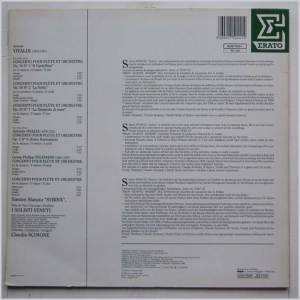 Format: Vinyl Record LP, Erato Records. France release. Classical music vinyl record LP release from Claudio Scimone, I Solisti Veneti. Classical music LP. A Classical music vinyl record album release featuring some of the top composers and performers. Lovely fresh and clean copy. Record label: Erato Records. France Grade: Vinyl EX, Jacket VG+ Stock: 1. Item: RM20795num75263 ---S