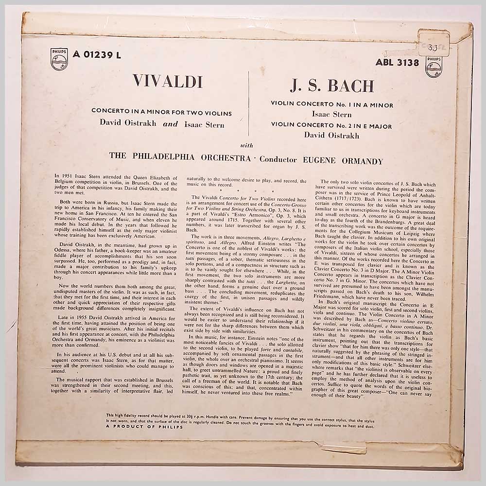 Format: Vinyl Record LP, Philips Records. UK release. Classical music vinyl record LP release from David Oistrakh, Isaac Stern, The Philadelphia Orchestra. Classical music LP. Housed in a flip back style jacket. A nice copy considering its age. Classical music vinyl record album release featuring some of the top composers and performers. Record label: Philips Records. UK Grade: Vinyl VG+, Jacket VG+ Stock: 1. Item: RM33460abl3138 ---O