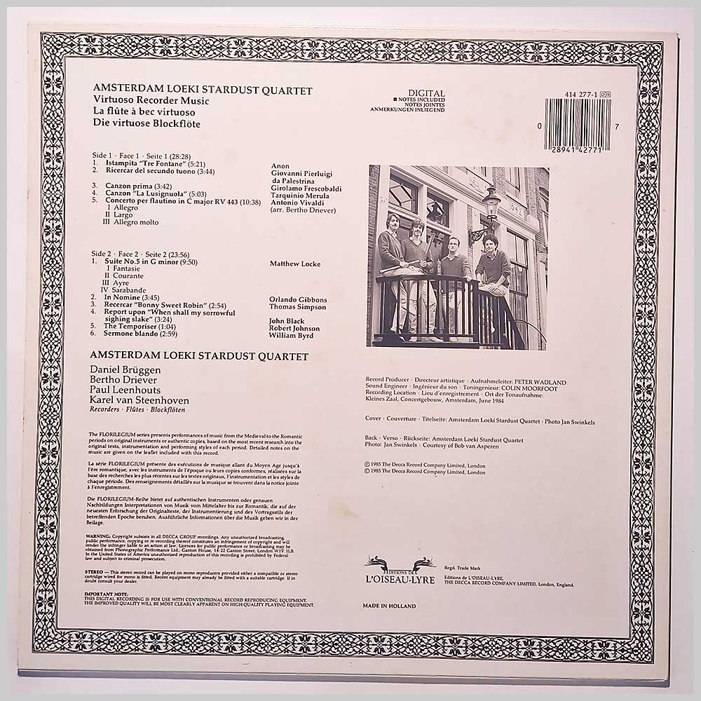 Format: Vinyl Record LP, L'Oiseau-Lyre Records. UK release. Classical music vinyl record LP release from Amsterdam Loeki Stardust Quartet. Classical music LP. Comes with the original notes sheet. The vinyl record appears to have had little or no play. Classical music vinyl record album release featuring some of the top composers and performers. Record label: L'Oiseau-Lyre Records. UK Grade: Vinyl EX, Jacket EX Stock: 1. Item: RM334004142771 ---A