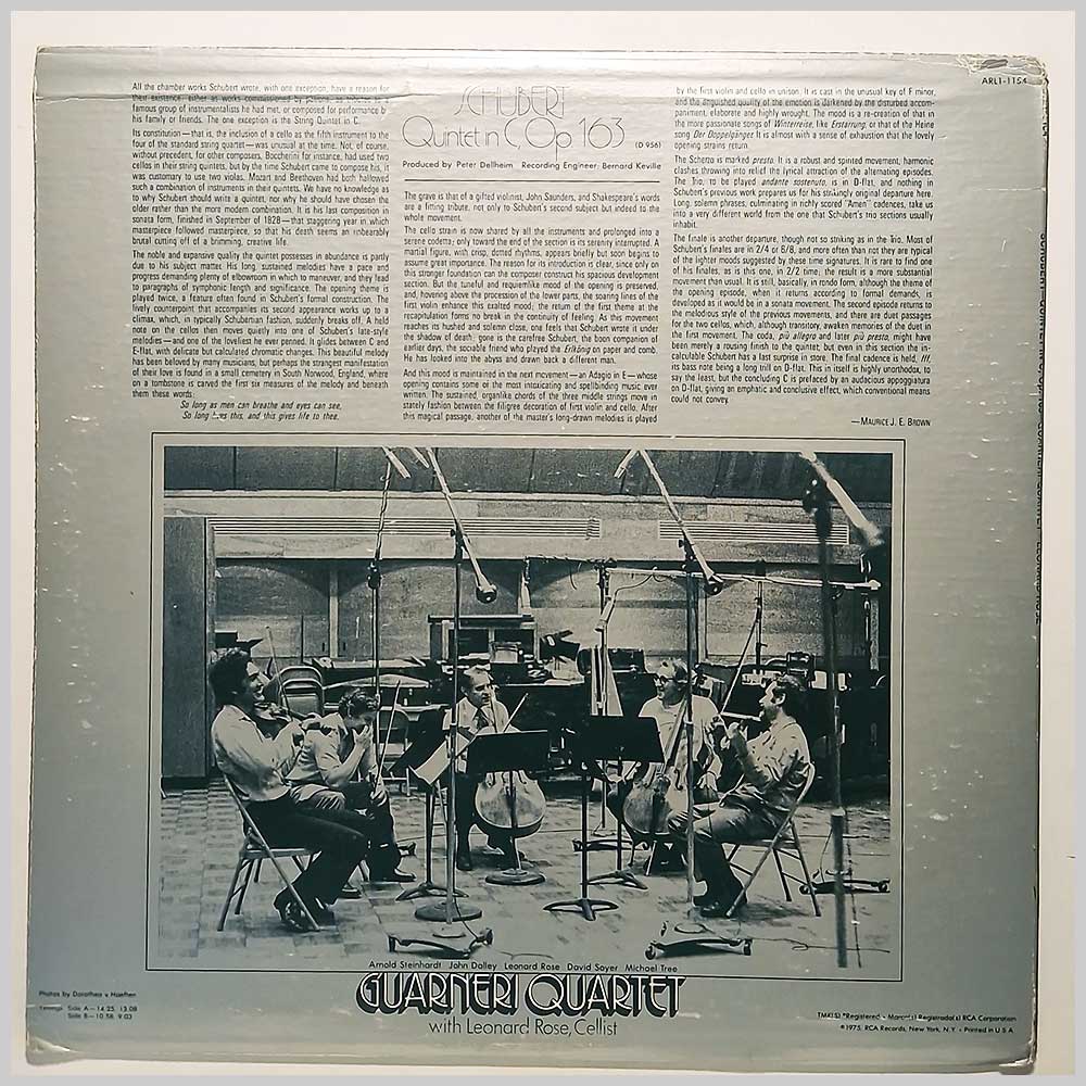 Format: Vinyl Record LP, RCA Records. USA release. Classical music vinyl record LP release from Guarneri Quartet, Leonard Rose. Classical music LP. Some wear to jacket edges. Some shelf wear to jacket. Classical music vinyl record album release featuring some of the top composers and performers. A United States vinyl pressing, hard to find outside the USA. Record label: RCA Records. USA Grade: Vinyl EX, Jacket VG Stock: 1. Item: RM33419arl11154 ---Q