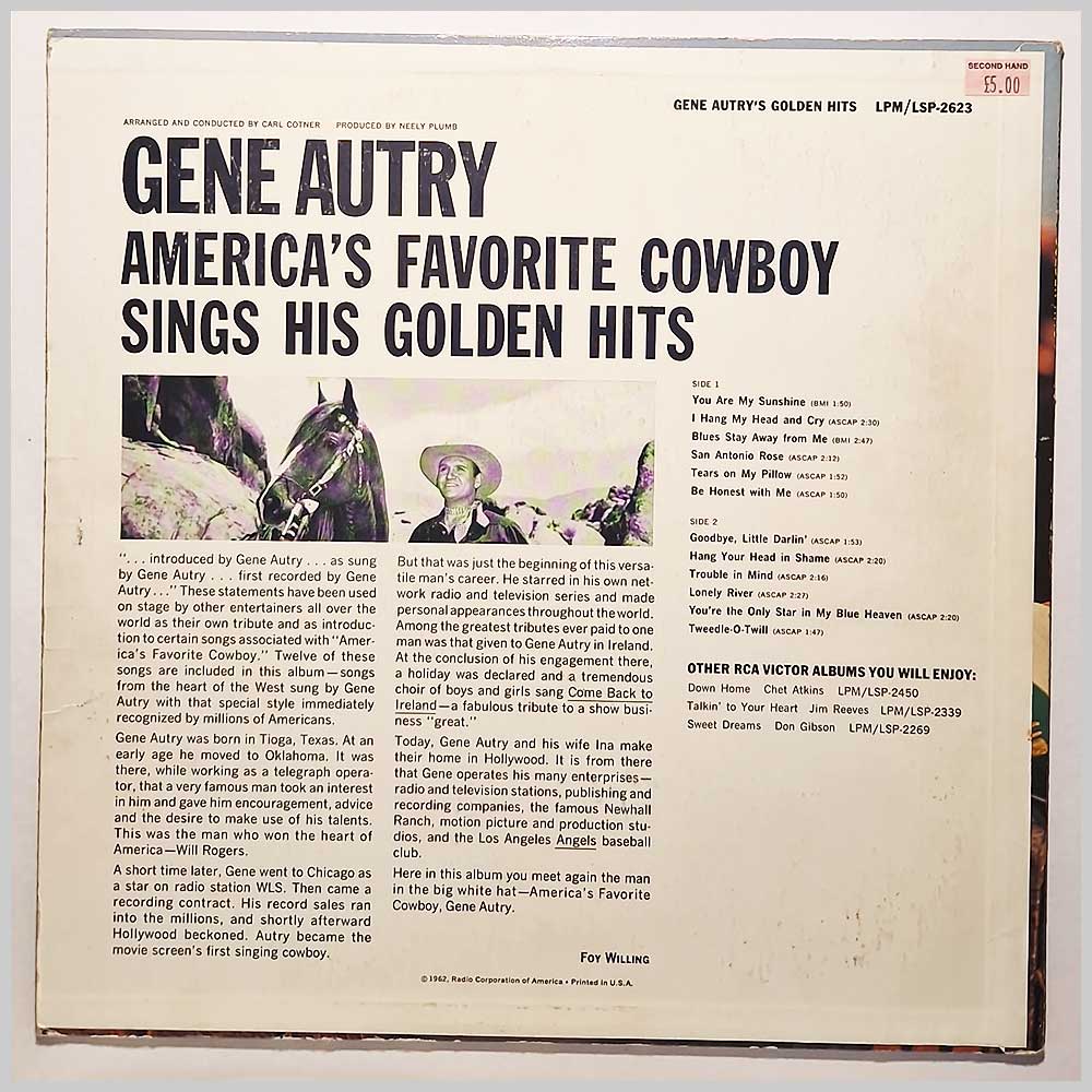 Format: Vinyl Record LP, RCA Records. USA release from 1962. Country music vinyl record LP release from Gene Autry. Classic Country music LP. A United States vinyl pressing, hard to find outside the USA. Record label: RCA Records. USA Grade: Vinyl VG+, Jacket VG+ Stock: 1. Item: RM33019lpm2623 ---A