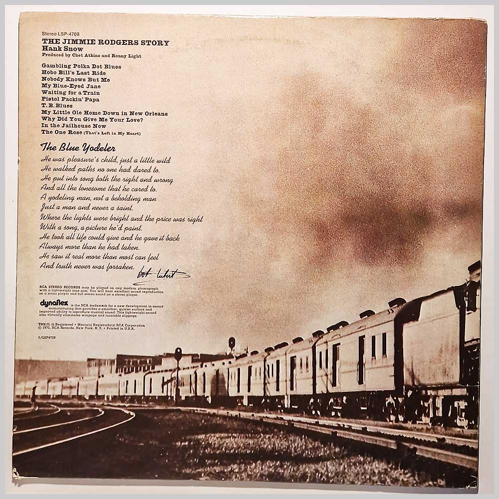 Format: Vinyl Record LP, RCA Records. USA release from 1972. Country music vinyl record LP release from Hank Snow. Classic Country music LP. Housed in a gatefold jacket. Dynaflex pressing. Some light handling wear and tear to jacket. A United States vinyl pressing, hard to find outside the USA. Record label: RCA Records. USA Grade: Vinyl VG+, Jacket VG+ Stock: 1. Item: RM33017lsp4708 ---S
