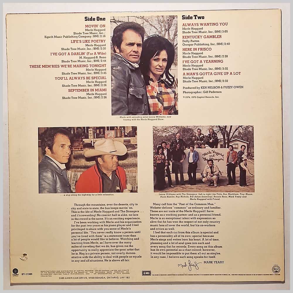 Format: Vinyl Record LP, Capitol Records. Canada release from 1975. Country music vinyl record LP release from Merle Haggard and The Strangers. Classic Country music LP. Small drill hole cut out of jacket. Some light scuffing to record. Record label: Capitol Records. Canada Grade: Vinyl VG, Jacket VG+ Stock: 1. Item: RM33010st11365 ---H