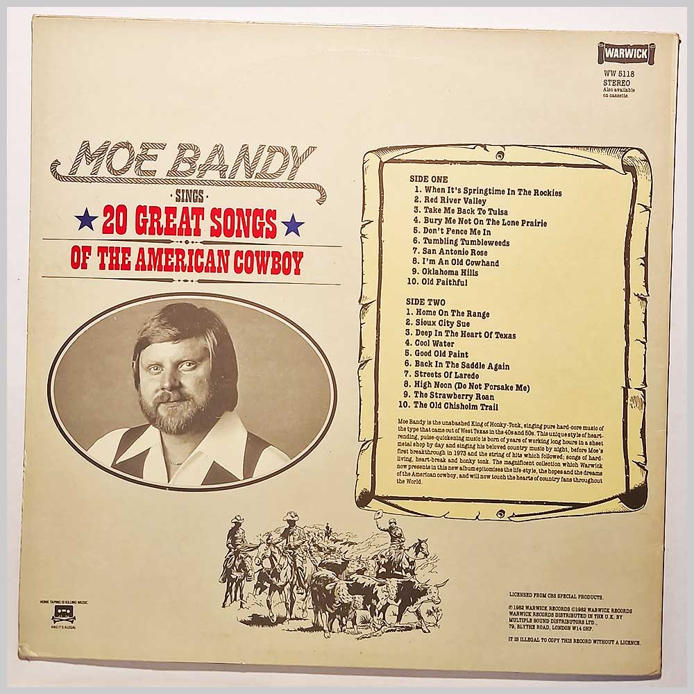 Format: Vinyl Record LP, Warwick Records. UK release from 1982. Country music vinyl record LP release from Moe Bandy. Classic Country music LP. Record label: Warwick Records. UK Grade: Vinyl VG+, Jacket VG+ Stock: 1. Item: RM33015ww5118 ---B