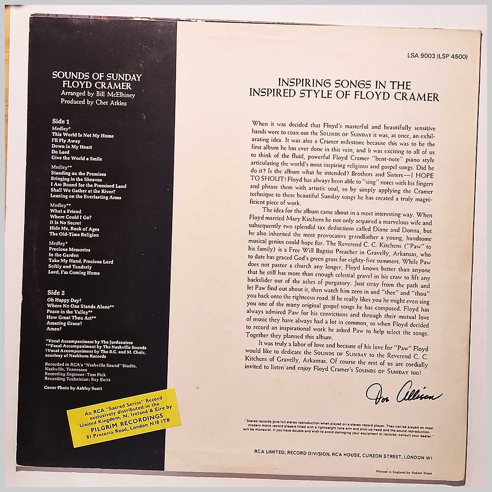 Format: Vinyl Record LP, RCA Records. UK release from 1971. Country music vinyl record LP release from Floyd Cramer. Classic Country Religious music LP. Small bit of sticker removal damage on front of jacket. Record label: RCA Records. UK Grade: Vinyl VG+, Jacket VG+ Stock: 1. Item: RM33490lsa9003 ---C